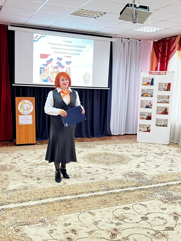 Семинар открыла заведующий детским садом Юлия Геннадьевна Рящикова. Она рассказала о реализации проекта «Музей Победы – время открыть историю», который был посвящен 80-летию Победы в Великой Отечественной войне и реализован на базе учреждения в 2025 году. В рамках проекта была создана музейная экспозиция.