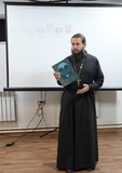 Перед началом мероприятия руководитель епархиального отдела религиозного образования и катехизации, настоятель храма священник Стахий Сахаров провел экскурсию по храму и территории, рассказал об устройстве православного храма, храмовых иконах, о празднике Введения во храм Пресвятой Богородицы.