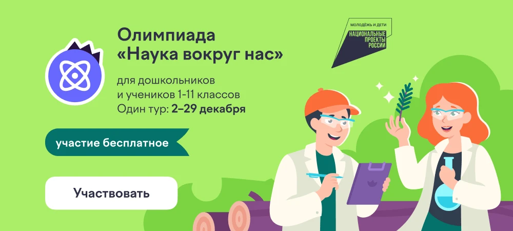 На Учи.ру проходит всероссийская бесплатная онлайн-олимпиада «Наука вокруг нас», которая проводится в соответствии с задачами национального проекта «Молодежь и дети». Присоединиться к соревнованию ученики 1–11 классов могут до 29 декабря включительно. Выполняя задания олимпиады «Наука вокруг нас», ребята: • проявляют интерес к естественным наукам; • знакомятся с физикой, химией, окружающим миром, географией, биологией; • изучают различные явления с точки зрения науки; • проводят исследования и осваивают нестандартные способы решения задач. Заинтересовать учеников естественными науками просто — расскажите об олимпиаде педагогам, родителям и детям, порекомендуйте принять в ней участие: https://clck.ru/3QfbPx