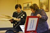 И конечно же ветераны не могли прийти без подарков. Музей пополнился новыми экспонатами. Книга с работами Сталина и Ленина 1935 г. издания с дарственной надписью ударнице учебы Хвалынского педучилища Антонине Сидоровой, в будущем учителя Матвеевской школы и мамы учителя начальных классов гимназии Ирины Николаевны Корневой пополнит комплекс по истории образования музея. Коллекционные альбомы монет «Города-столицы государств, освобожденные советскими войсками от немецко- фашистских захватчиков» и с памятной банкнотой и набором монет «Крым Севастополь» подарены учителем химии Татьяной Евгеньевной Каршиной, будут интересны любителям истории. С воодушевлением приглашенные рассматривали альбомы с фотографиями. Приятно увидеть знакомые, родные лица, вспомнить события, учеников.