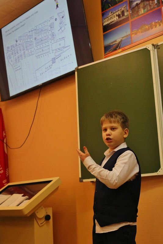 Учащийся 3а класса Дмитрий Атемасов рассказал, как менялась карта города до строительства школы № 17. Фотокадры старого Балаково, менялись на экране, а присутствующие отвечали на его вопросы.