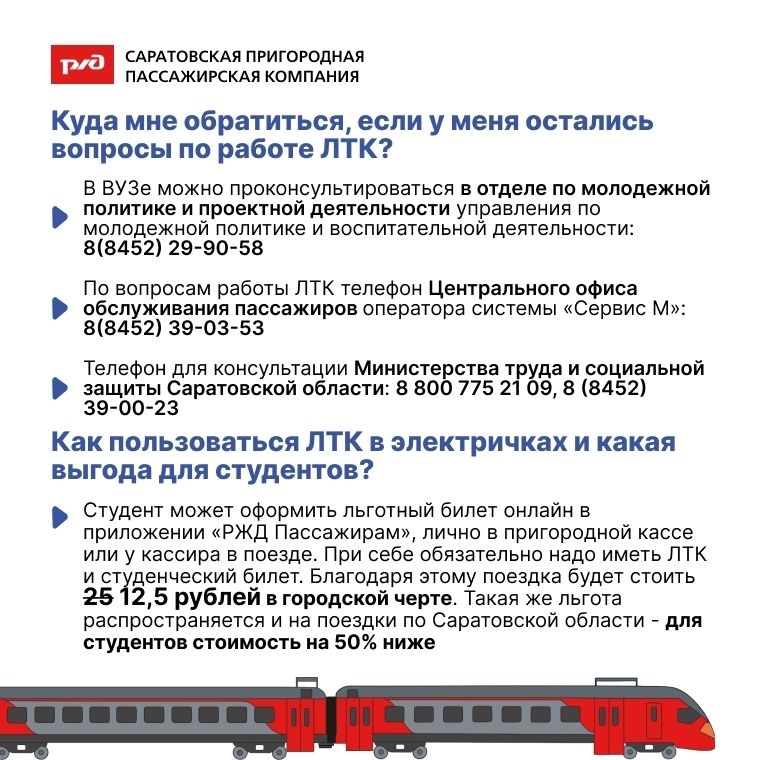 Карту можно использовать для оплаты льготного проезда не только на электротранспорте, автобусах и внутреннем водном транспорте, но и на железнодорожном транспорте пригородного сообщения – обучающимся очной формы предоставляется льгота в 50 %