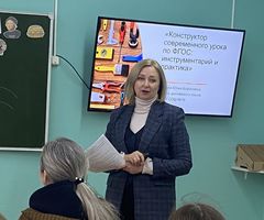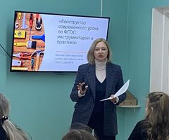 Мастер‑класс «Конструктор современного урока по ФГОС: инструментарий и практика» провела Карпова Юлия Борисовна, учитель английского языка МАОУ СОШ № 16. Выступление представило собой пошаговое руководство по проектированию урока. Педагог продемонстрировала: